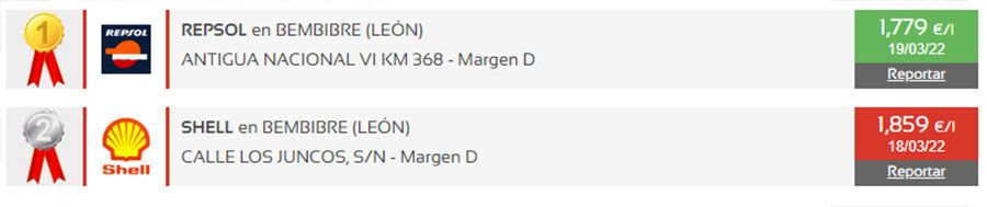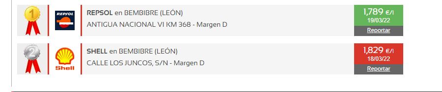 En Bembibre la más barata es la gasolinera Repsol en la antigua nacional VI km 368 en la que cuesta 1,779 euros/litro y la más cara la Shell, en calle los juncos 1,859 euros/litro.