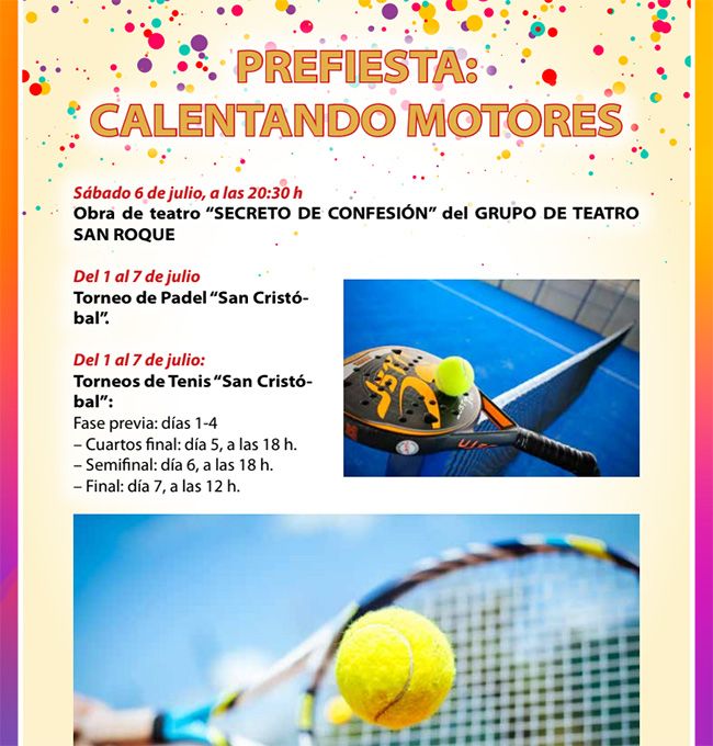 Como prefiesta y para calentar motores tendrá lugar el dia 6 de julio a las 20.30 horas la obra de teatro ''Secretos de confesión'' a cargo del grupo teatral San Roque; del 1 al 7 de julio se organiza el torneo de padel ''San Cristóbal'' y el torneo de tenis ''San Cristóbal'' (Tenis: Fase previa: días 1-4, cuartos final: día 5, a las 18 horas, semifinal: día 6, a las 18 h y final:día 7, a las 12 h.
