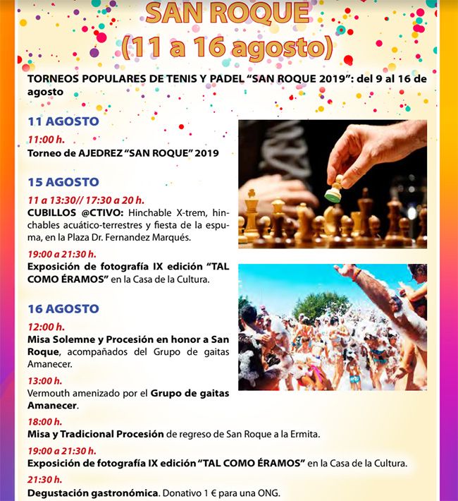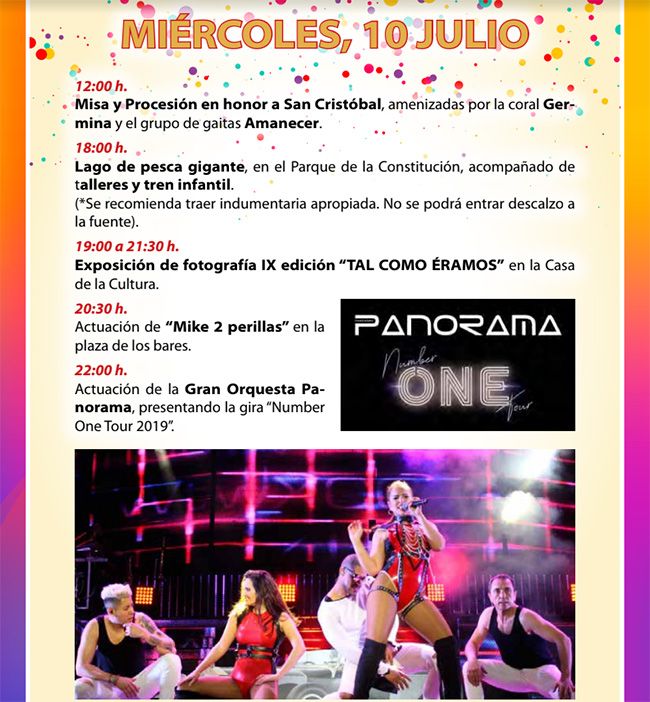 El miércoles 10 de julio las fiestas del municipio darán el pistoletazo de salida a las 12.00 horas con la misa y procesión en honor a San Cristóbal. A las 22.00 horas la famosa orquesta Panorama actuará presentando la gira ''Number One Tour 2019''