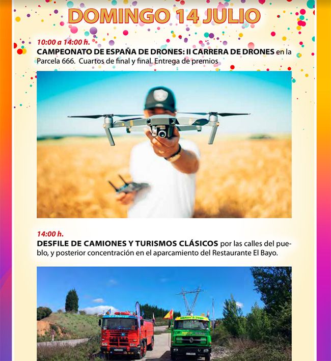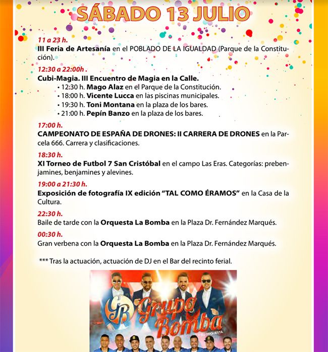 El sábado 13 de julio tendrá lugar el II Campeonato de España de drones, el XI Torneo de Fútbol 7 San Cristobal y entorno a las 22.30 horas comenzará la actuación de la orquesta Bomba.
