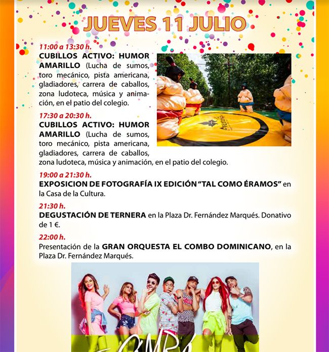 La jornada del 11 de julio estará marcada por actividades de Humor Amarillo, lucha de sumos, toro americano, gladiadores, zona ludoteca, música y animación en el patio del colegio. A las 22 horas la orquesta El Combo Dominicano en la plaza Dr. Fernández Marqués.