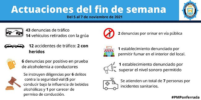 Este fin de semana han tenido lugar 12 accidentes aunque 'sólo' ha habido 2 heridos. Cabe recordar que durante la madrugada del viernes al sábado un conductor, que presentaba signos de haber bebido, estacionó su vehículo en la Avenida Compostilla de la capital berciana en un sitio que impedía la circulación normal de los coches. El hombre no se despertó ni siquiera cuando la Policía Municipal se personó en el lugar de los hechos.