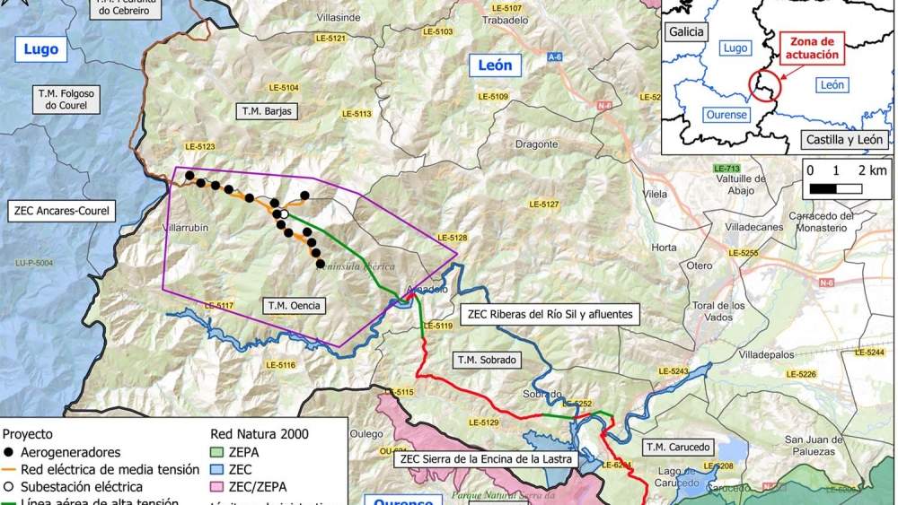 La edición de este jueves el Boletín Oficial del Estado (BOE) ha publicado la resolución del impacto ambiental del proyecto «Planta eólica Oencia, de 217 MW de potencia instalada, y sus infraestructuras de evacuación, en las provincias de León y Ourense» promovido por Cefiro Holdco 3, SL. Así, la Dirección General de Infraestructuras y Sostenibilidad Ambiental de la Junta de Castilla y León informa desfavorablemente sobre el proyecto, citando, entre otros aspectos, sus importantes efectos sinérgicos y acumulativos, principalmente sobre el paisaje, los hábitats y la fauna.