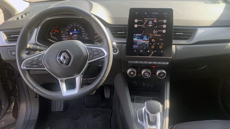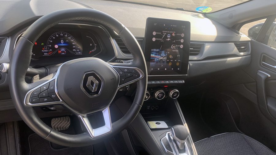 Sin duda, la característica principal del Captur E-Tech híbrido la encontramos en la parte mecánica. La transmisión del Renault Captur E-Tech merece un espacio explicativo porque es peculiar, pero funciona muy bien. Físicamente, encontramos una caja de cambio de cuatro relaciones, pero que carece de embrague. Su papel lo cubre el motor eléctrico de 20 CV, que se encarga de ajustar la velocidad de giro del motor térmico para, según Renault, disponer de un abanico de 15 velocidades virtuales. En la práctica, las sensaciones al volante están más cerca de las de una transmisión de variador continuo que de las de una caja automática convencional, pero su funcionamiento es notablemente más refinado y agradable que el de una de variador continuo. Por otra parte, esta caja de cambio dispone de un modo Brake (‘B’) para forzar la regeneración de energía en fases de deceleración y frenada y así recargar la batería. Renault asegura que se podrá completar hasta un 80% del tiempo en modo eléctrico siempre que se use en ámbito urbano, consiguiendo un ahorro del 40% en consumo en comparación con su equivalente de gasolina.