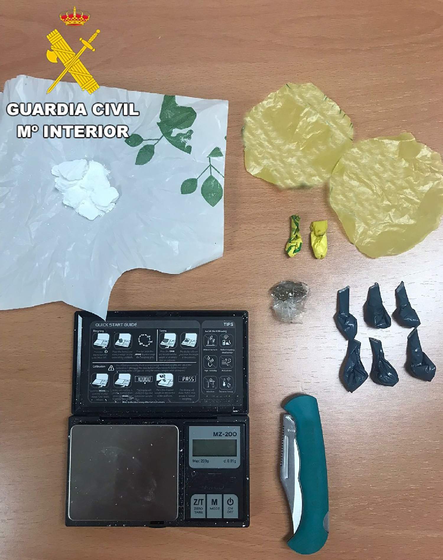 La Guardia Civil ha detenido a un varón como supuesto autor de un delito contra la Salud Pública en su modalidad de tráfico de drogas. Se le han decomisado una báscula de precisión; unos 10 gramos de cocaína; 6 de metanfetamina-speed, y una pequeña cantidad de hachís, todo ello distribuido en envoltorios individuales dispuestos para su venta.