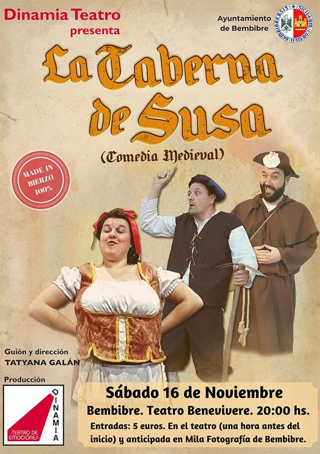 La compañía berciana Dinamia Teatro representará su mítica comedia "La Taberna de Susa" sobre las tablas del Teatro Benevívere de Bembibre el próximo sábado 16 de noviembre. Este espectáculo suma ya 48 representaciones en poco más de dos años y, después de completar en dos ocasiones el aforo de la Sala Río Selmo de Ponferrada, visitará la capital del Bierzo Alto.