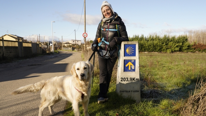 "Este es mi noveno camino ya, y el primero de la pequeña de la casa, que ya tiene un año y ocho meses. El año pasado también lo hice en enero, aunque de una semana más, desde Frómista, 450 kilómetros. Es cuando puedo por agenda y porque vas prácticamente sola y yo por las tardes escribo y trabajo. Es un momento más difícil porque cierran la mayoría de sitios, pero también es muy especial. Soy de Ávila, me gusta caminar con frío, aunque este camino está siendo meteorológicamente más duro, pero como es el primero de Phoebe, pues es muy mágico verla así, descubriendo todo."