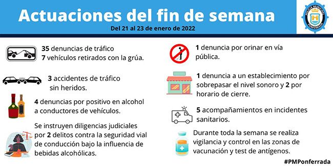 Además, en las calles del municipio el fin de semana se saldó con tres accidentes de tráfico, aunque en ninguno de ellos hubo que lamentar la existencia de heridos de consideración. Los agentes también colaboraron durante toda la semana en las labores de vigilancia y control de la zona de vacunación del Hospital y de la zona donde se practican los test de antígenos, en el centro de salud Ponferrada II.