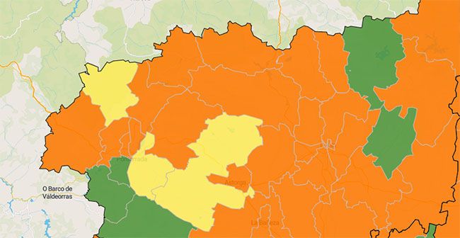 La única nota positiva de la jornada la pone el área de Ponferrada I, con la reducción de alerta de naranja a amarillo. Junto a ella está Fabero y en verde se mantienen Ponferrada III y Puente. El alerta naranja' por incidencia alta continúan el resto de zonas básicas del Bieroz y Laciana Ponferrada II, Ponferrada IV, Bembibre, Cacabelos, Villafranca, Toreno y Villablino.