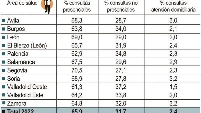 Mientras, en la zona de Valladolid Oeste, las consultas presenciales representaron un 61,28 por ciento, la cifra más baja del global autonómico, aunque partía de un 45,63 por ciento. Palencia también obtuvo datos inferiores a la media autonómica, un 62,87 por ciento, pero subió de manera importante desde el 49,48 por ciento, al igual que la de Burgos, que evolucionó de un 52,43 por ciento, a un 63,82.