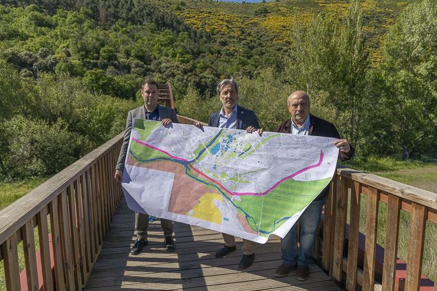 El candidato a la alcaldía por CB, Pedro Muñoz (C), junto a los números 2 y 3 de la lista, Iván Alonso (I) y Jesús López durante la presentación del proyecto / Mario de la TorreEl candidato de Coalición por el Bierzo (CB) a la Alcaldía de Ponferrada, Pedro Muñoz, presentó este lunes uno de los proyectos estrella de su programa electoral en materia de urbanismo, la llamada ronda sur de la ciudad, un vial de unos 3 kilómetros de longitud que conectaría la zona del Auditorio Municipal con el barrio de San Andrés y que también contempla la construcción de un puente sobre el río Boeza. Según avanzó Muñoz, la ejecución de este proyecto será una de las prioridades políticas de la formación bercianista ya que “descongestionaría el tráfico del barrio de la Estación, la avenida de Portugal y la avenida del Castillo”.