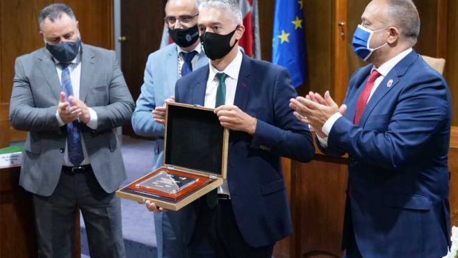 Antes de entregar una placa conmemorativa al jefe de Urgencias del Hospital del Bierzo, José Ramón Casal, como representante de los trabajadores del sector sanitario, el regidor valoró el papel de estos profesionales en la lucha contra la propagación del coronavirus y exigió un “compromiso público y firme” a las administraciones en cuestiones que tienen que ver con la sanidad de la comarca, como la creación de una unidad de radioterapia o la construcción del centro de especialidades múltiples de Ponferrada.