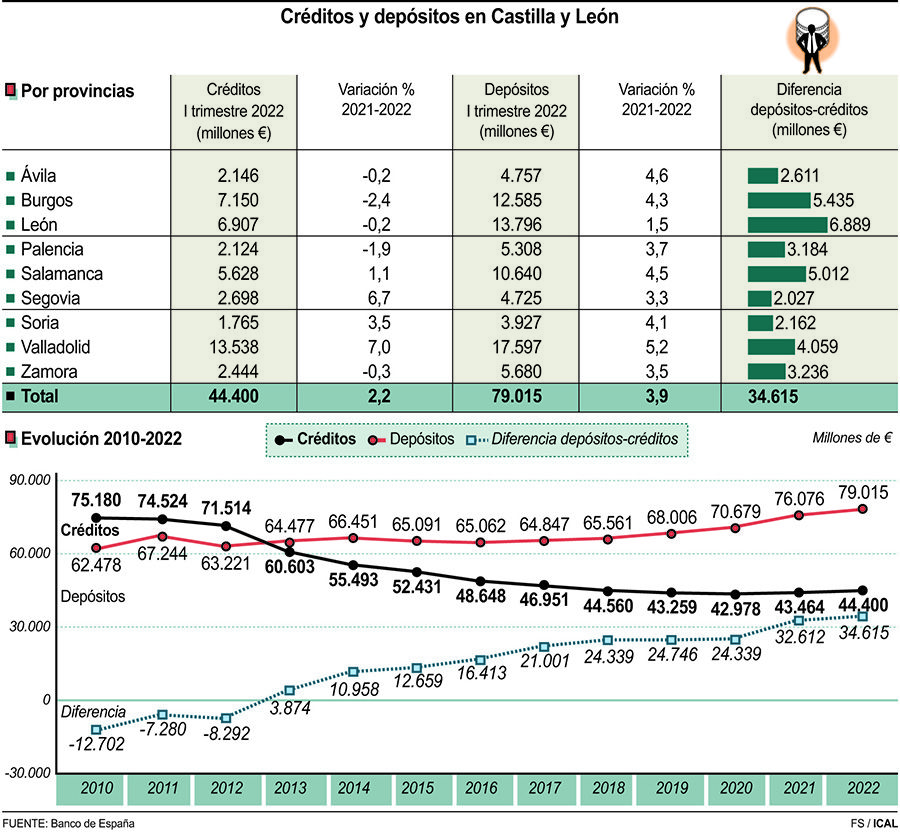 En este sentido, el ahorro de los castellanos y leoneses sirve para financiar otras economías, ya que la diferencia entre créditos y depósitos ya alcanza los 34.615 millones de euros. Una cifra de ahorro neto también en máximos, que servirá para hacer frente a meses complicados que se avecinan con la mala coyuntura económica por los elevados precios, que no paran de subir, por los costes energéticos, y la crisis de abastecimiento de materias primas, en un contexto derivado de la guerra de Ucrania.
