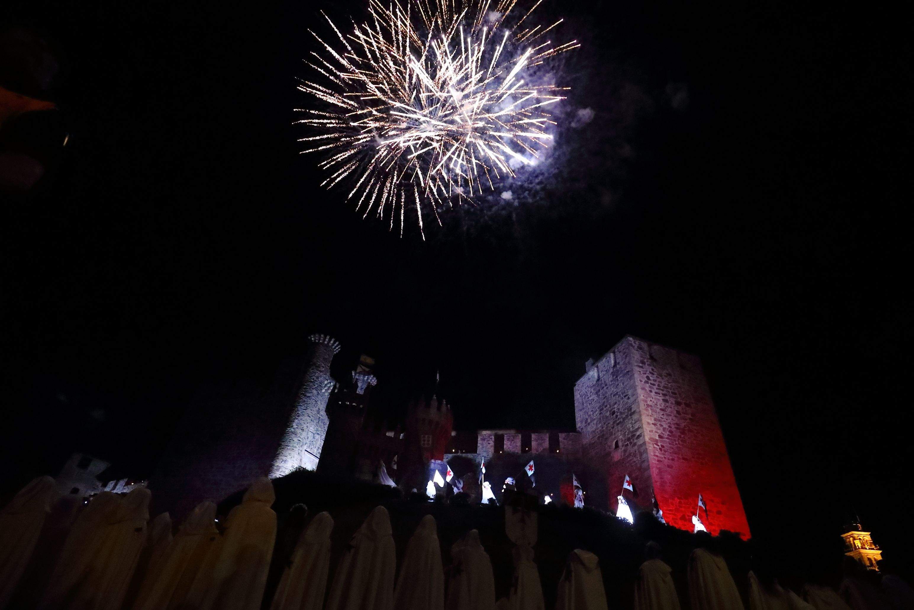 “Yo, Guido de Garda, maestre de la fortaleza de Ponsferrata, comprometo a todo el pueblo de Ponferrada para que vuelva cada año a renovar este compromiso festivo con su historia y su leyenda hasta que el tiempo llegue a borrar la línea del horizonte”. Con estas palabras la capital berciana retoma después de la pandemia su voto templario. El momento culmen, la entrada por la portada del castillo, estuvo como es habitual acompaña por la sublime participación de la Banda de Música Ciudad de Ponferrada.