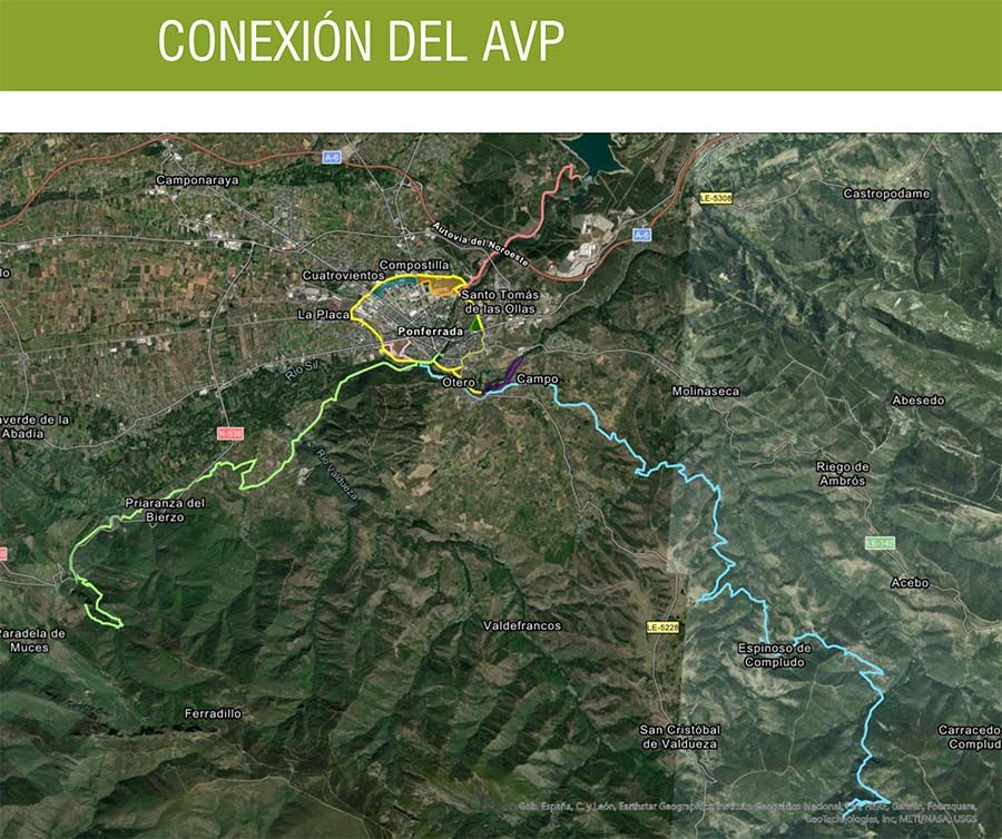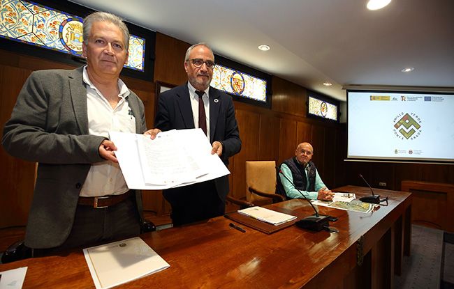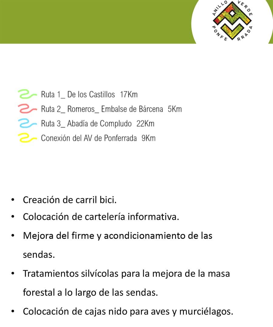 El alcalde de Ponferrada, Olegario Ramón (C), junto a la concejala de Hacienda, Mabel Fernández y el presidente de la Fundación Naturaleza y Hombre, Carlos Sánchez (I), durante la presentación del proyecto de Anillo VerdeEn cuanto al acondicionamiento de las sendas, se acometerán actuaciones en la Ruta de los Castillos, que une el Castillo de los Templarios de Ponferrada y el Castillo de Cornatel, en Priaranza del Bierzo, en la Ruta de los Romeros, y en la Ruta de la Abadía de Compludo. Además de importantes actuaciones de reforestación con ejemplares autóctonos, eliminación de especies invasoras y actuaciones encaminadas al fomento de la biodiversidad, se habilitarán 5 kilómetros de carril bici.