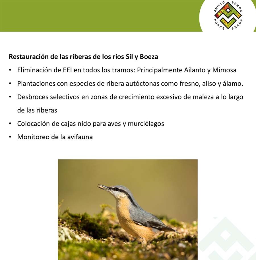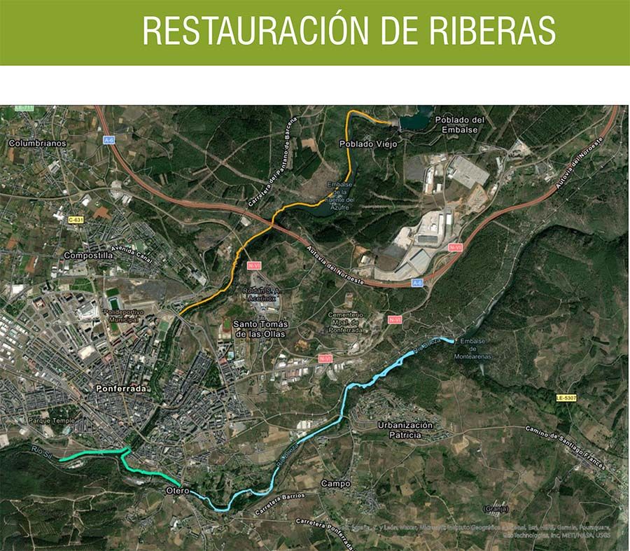 Asimismo, el proyecto contempla tres actuaciones para la mejora de las riberas de los ríos: una sobre 4 kilómetros en la ribera del río Sil, desde el puente del Centenario hasta el embalse de Bárcena; otra en un tramo de 9,1 kilómetros en la ribera del río Boeza, desde el puente Boeza hasta el embalse de Montearenas; y finalmente otra actuación en un tramo de 1,8 kilómetros