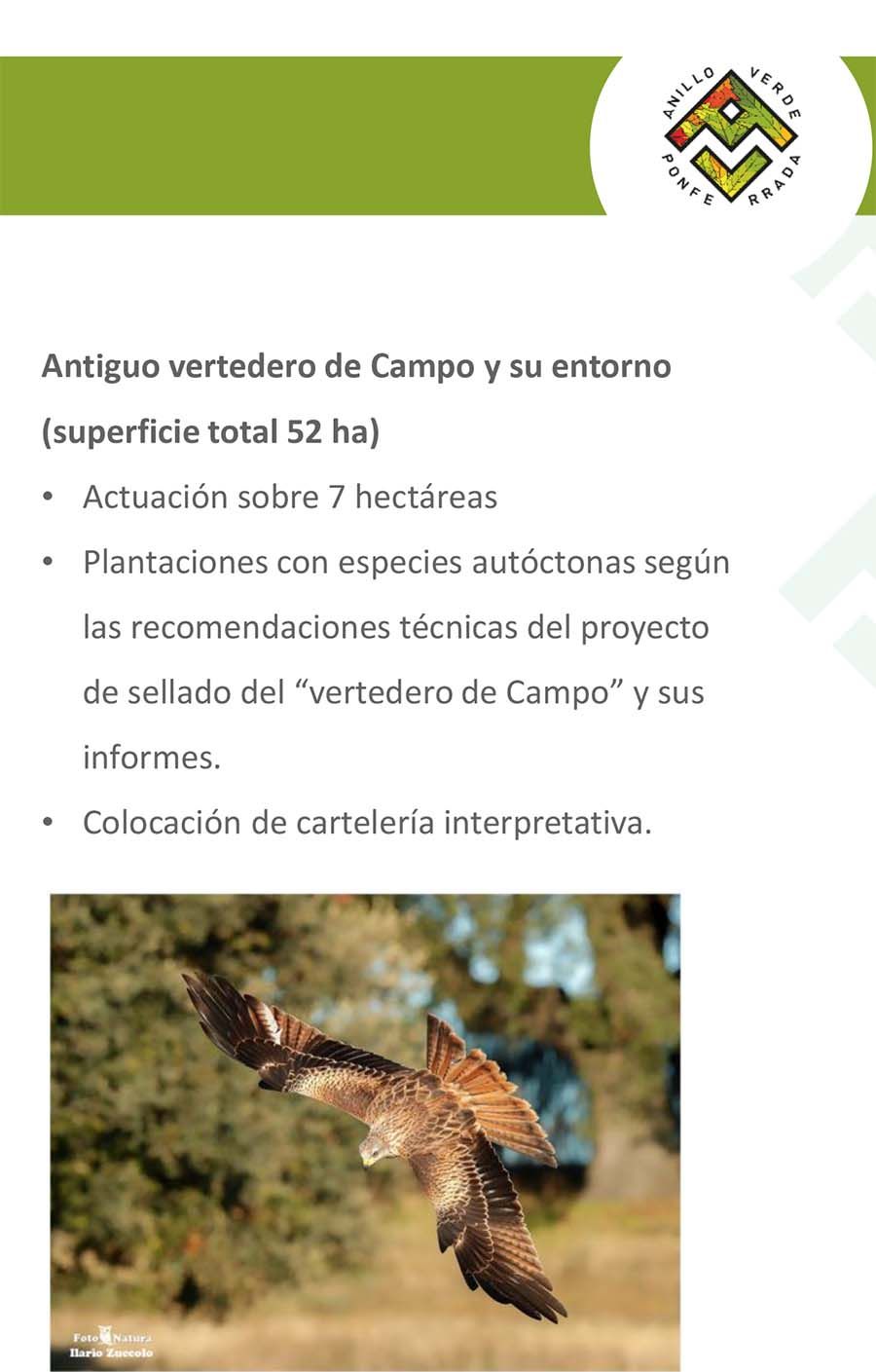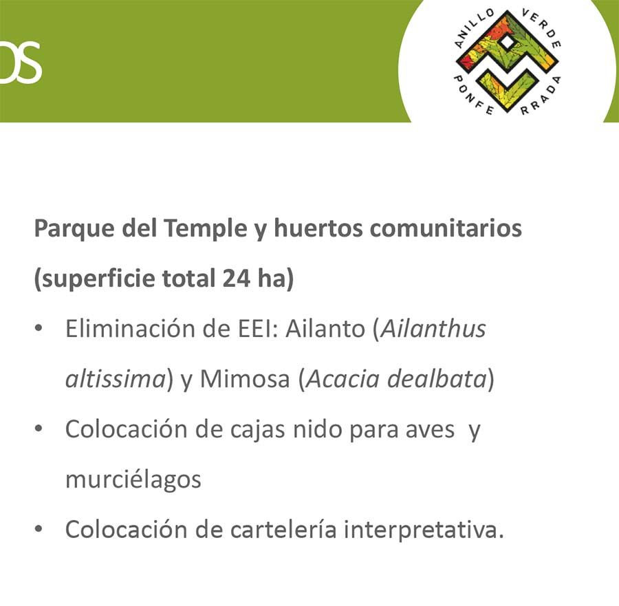 Durante la jornada de firma del convenio de colaboración, los representantes de ambas instituciones presentaron el proyecto Anillo Verde de Ponferrada, que dio comienzo el pasado 1 de julio y finalizará el 31 de diciembre del 2025. Las acciones a realizar en el marco del proyecto tendrán como objetivo general una "renaturalización de la ciudad que resulte en la mejora de la biodiversidad, la adaptación al cambio climático y la calidad de vida y salud de los habitantes de Ponferrada", tal y como han explicado a través de una nota de prensa remitida este martes.