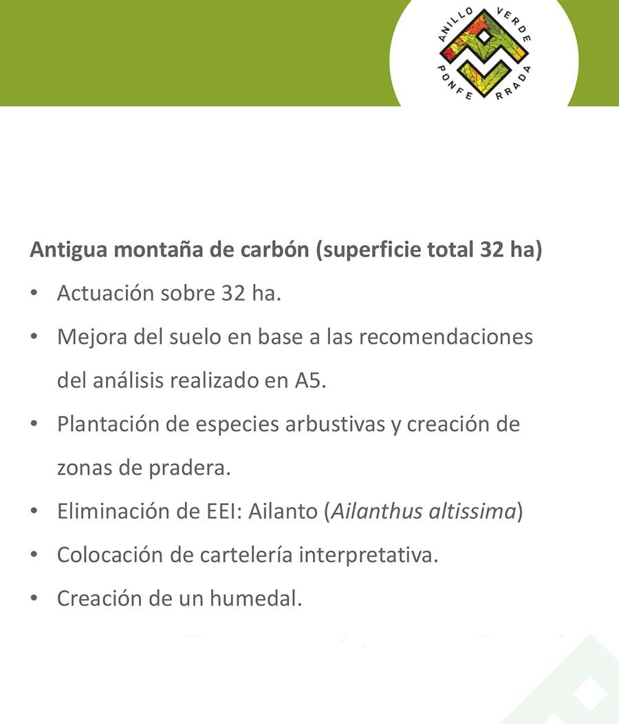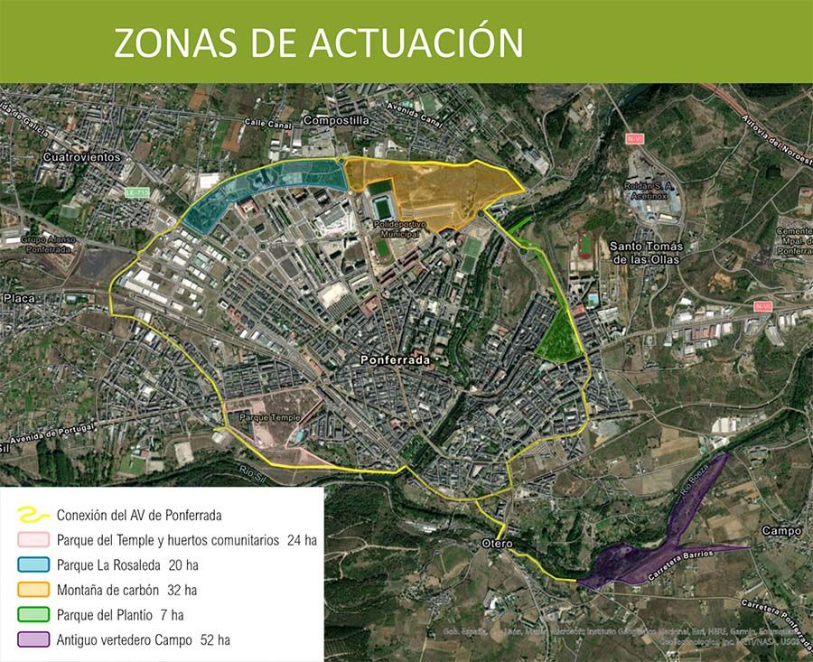 Entre las actuaciones más destacables, figuran la recuperación medioambiental de 7 hectáreas en el antiguo vertedero de Campo, la intervención en dos hectáreas en la ampliación del parque del Plantío, en otras dos hectáreas en el parque de la Rosaleda, en 24 hectáreas en la zona del parque del Temple y los huertos comunitarios, y una actuación en 32 hectáreas para la recuperación de la zona degradada y contaminada de la antigua montaña de carbón.