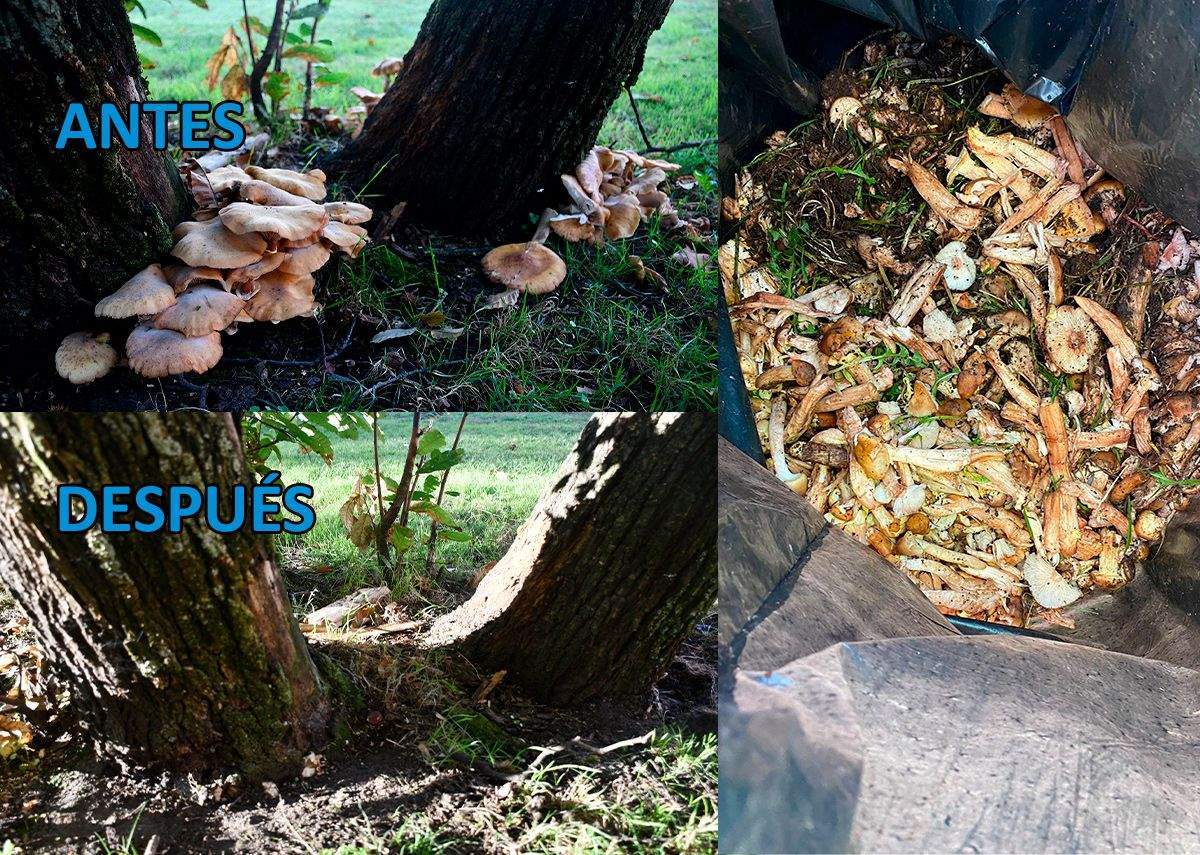 Foto: Armillaria Mellea en el Parque del Temple. Fotografía tomada por Dani Merino (InfoBierzo), el jueves 10 de noviembre del 2022, un día antes de la eliminación del hongo por parte del Ayuntamiento de Ponferrada / InfoBierzoLos operarios han retirado en las últimas horas las Armillaria Mellea presentes en en Temple, confirma a InfoBierzo, el Jefe de Parques y Jardines de Ponferrada, Roberto Canedo. Sin embargo, la eliminación de la especie que se puede observar encima de la tierra, no será la única acción que ejecuten desde el Ayuntamiento de Ponferrada para combatir al hongo parásito, ya que el lunes, 14 de noviembre, el Parque del Temple recibirá un "fungicida sistémico" sobre el propio sustrato, más concretamente el producto llamado Aliette WG. Posteriormente, dentro de 15 días, la localización verde de la zona baja de Ponferrada también recibirá otro tratamiento, y en este caso, será un tratamiento de "tricodermias", unos hongos parásitos que combaten a otros hongos parásitos, como lo es la Armillaria Mellea.
