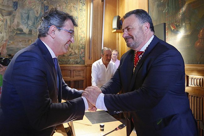El secretario provincial del PSOE, Javier Alfonso Cendón, acompaña al presidente de la Diputación de León al acto de toma de posesión de la corporación