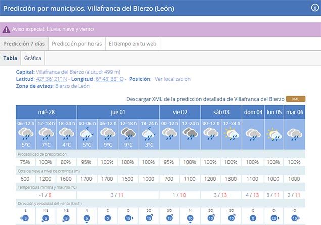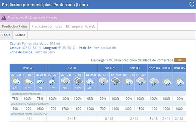 En Ponferrada se esperan mínimas de un grado bajo cero y máximas que alcanzarán los 11 grados a primera hora de la tarde. Las probabilidades de precipitación son casi del 100% a lo largo de toda la jornada.