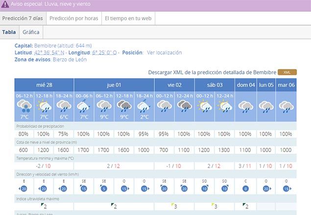 Bembibre, donde la cota de nieve se sitúa a esta hora en los 600 metros, alcanzará mínimas de menos dos grados y máximas de 100. La lluvia será la constante durante las próximas horas.