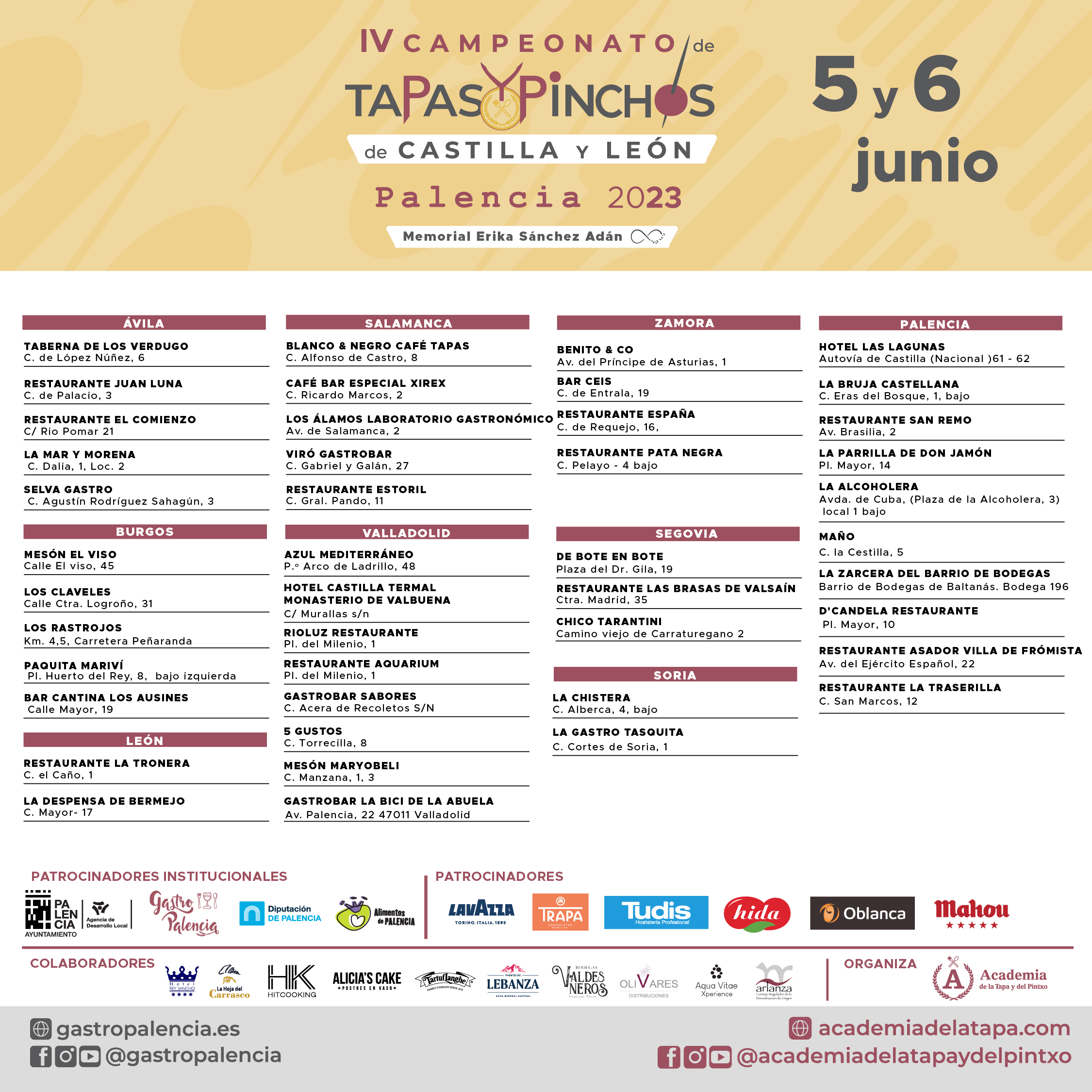 Esta gira, con lo mejor de la gastronomía en miniatura de las nueve provincias de la Comunidad, es posible gracias al apoyo y patrocinio institucional del Ayuntamiento de Palencia, la Agencia de Desarrollo Local, la Diputación de Palencia y Alimentos de Palencia. Junto al patrocinio de: Mahou, Grupo Oblanca, Tudis Hostelería, Trapa, Hida Alimentación y Lavazza. Con la colaboración de: la D.O. Arlanza, Olivares Distribuciones, Bodegas Valdesneros, Aqua Vitae Xperience, Fuentes de Lebanza, Tartuflanghe, Hitcooking, Alicia´s Cake, Hotel Rey Sancho y La Hoja del Carrasco.