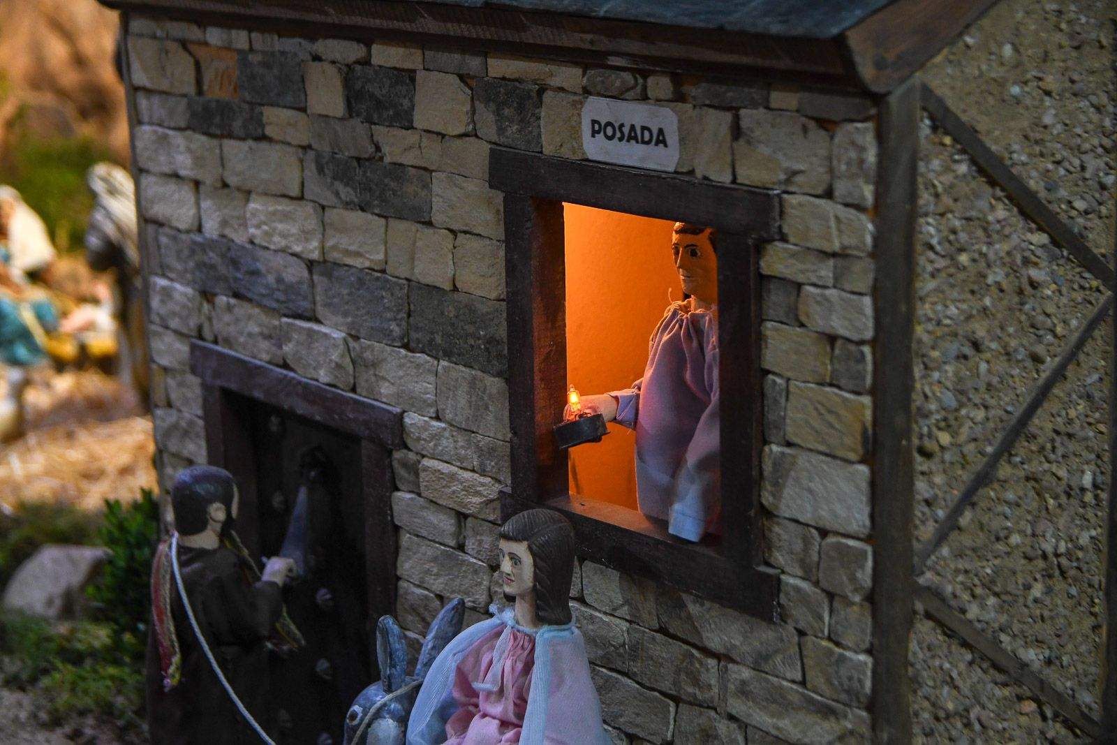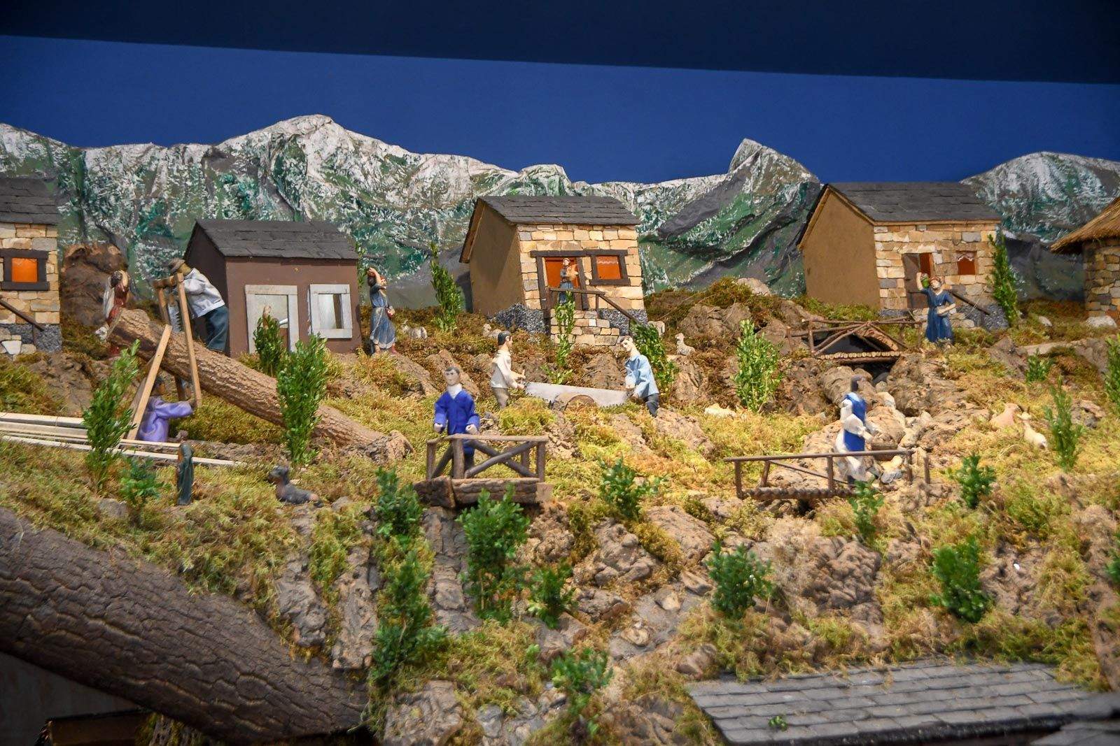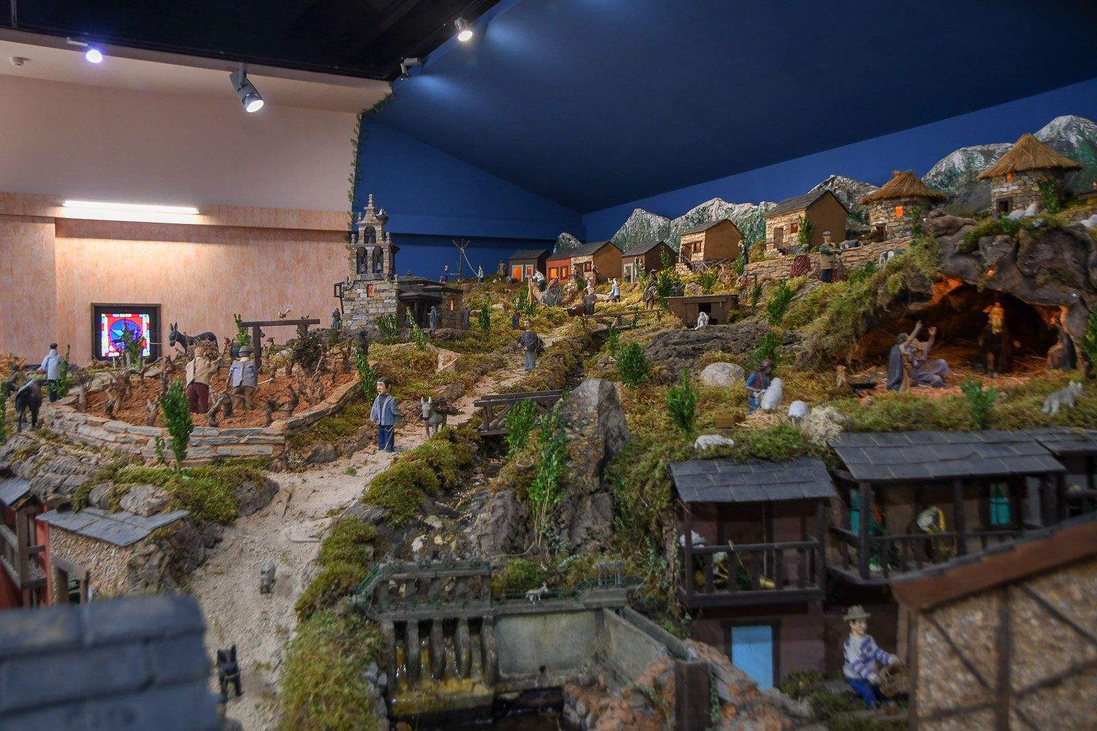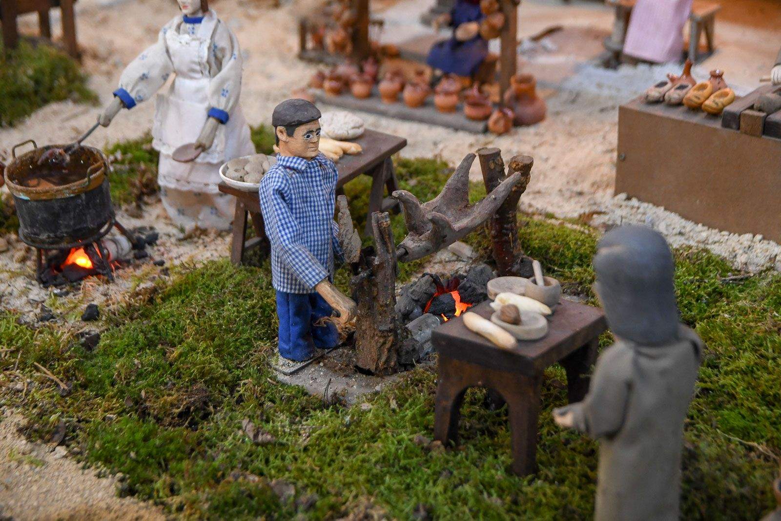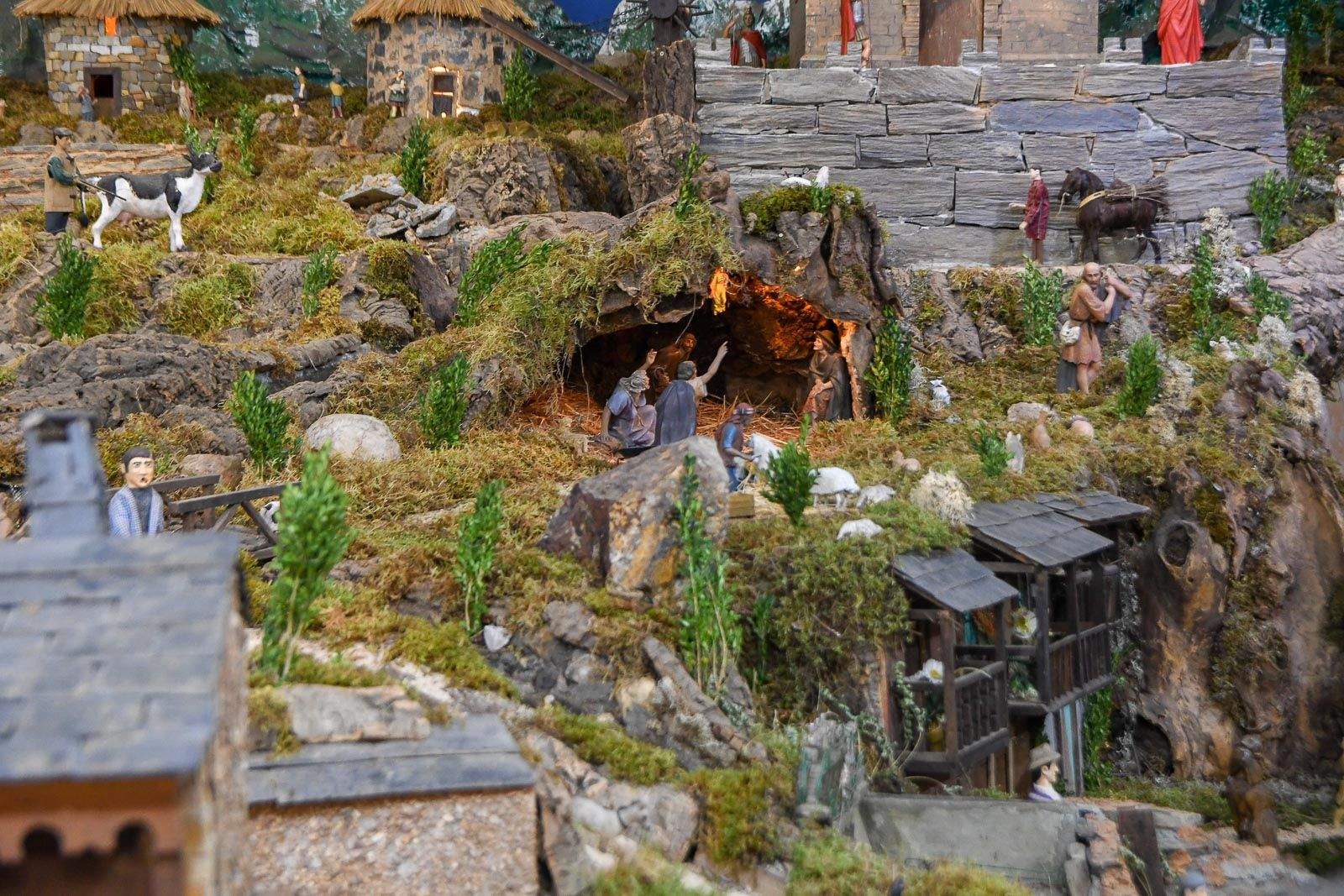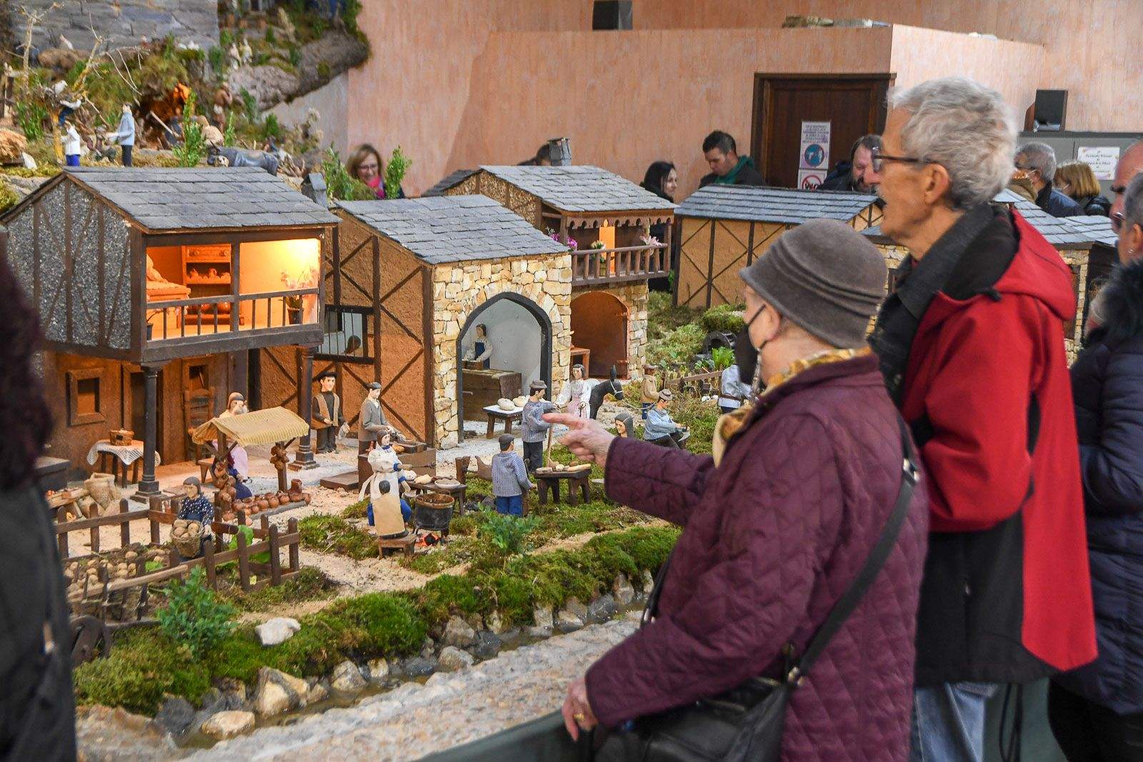 La escuela con el maestro enseñando a los alumnos, una partida de cartas en un bar cualquiera de la localidad y hasta el propio Ayuntamiento son otros de los elementos que no faltan en este Belén que termina su recorrido con la escenificación del Nacimiento.