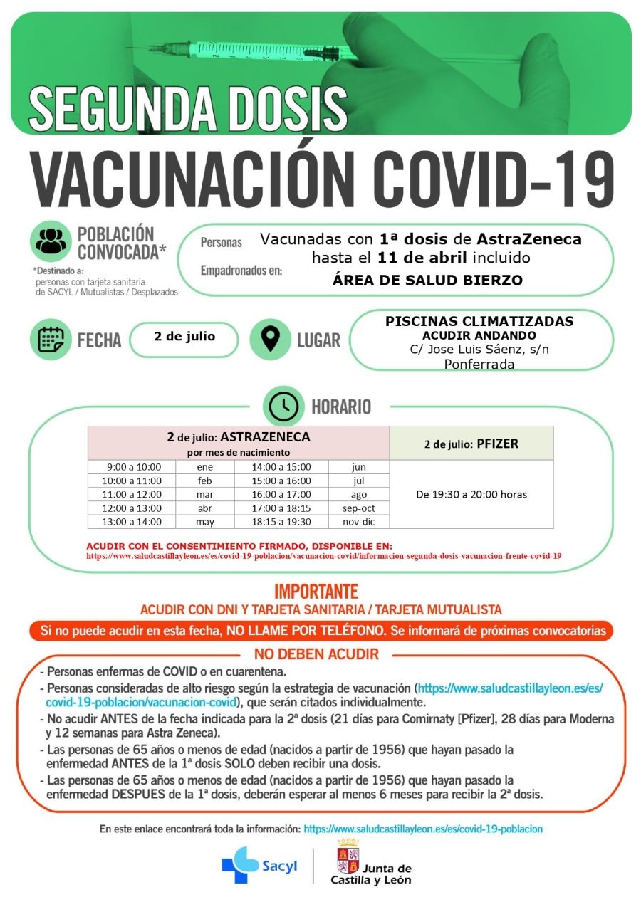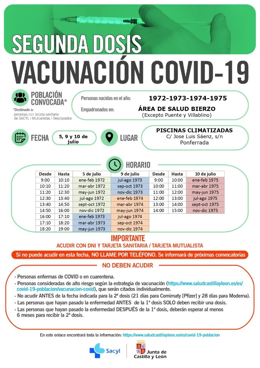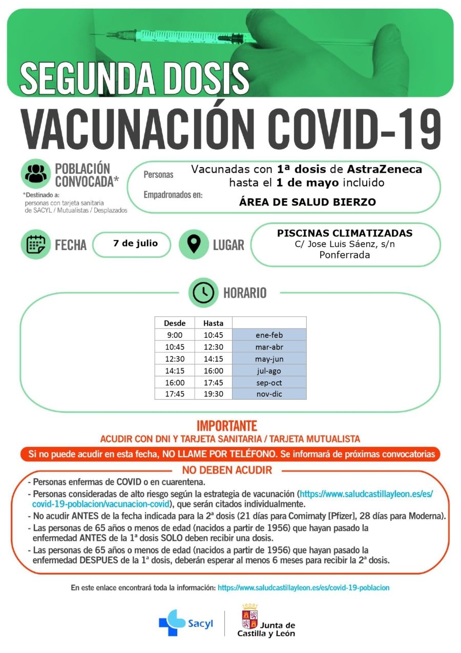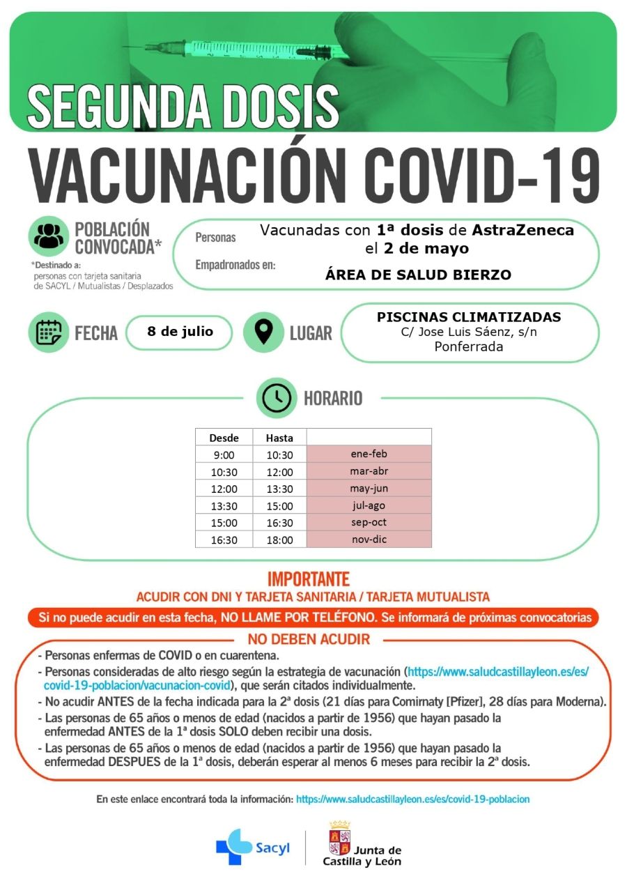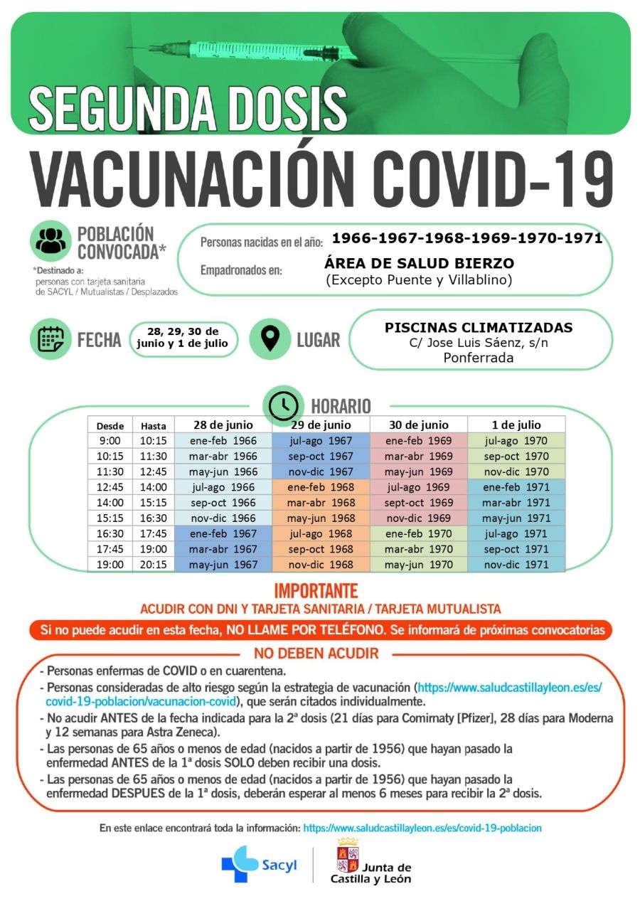 Avanza a 'velocidad crucero', eso sí, la administración de segundas dosis en Ponferrada, que se prolongará al menos hasta el 10 de julio según las citaciones disponibles en el portal de SACYL donde la Junta publica cada llamamiento.