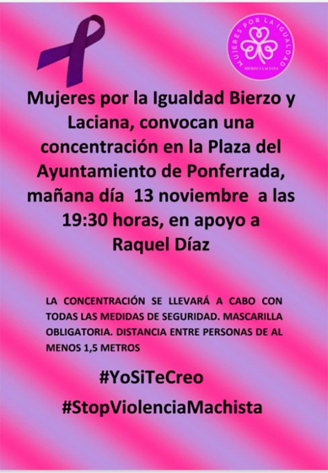 El colectivo Mujeres por la Igualdad del Bierzo y Laciana ha convocado una concentración este viernes 13 de noviembre, a las 19.30 horas, en la plaza del Ayuntamiento de Ponferrada en apoyo a la berciana Raquel Díaz. Bajo los lemas #YoSíTeCreo y #StopViolenciaMachista, la movilización se celebrará con todas las medidas de seguridad anti-COVID, tras hacerse públicos más detalles de las declaraciones de la abogada berciana en el caso contra su marido, el ex político Pedro Muñoz, en prisión desde el pasado junio acusado de intento de homicidio y malos tratos continuados.