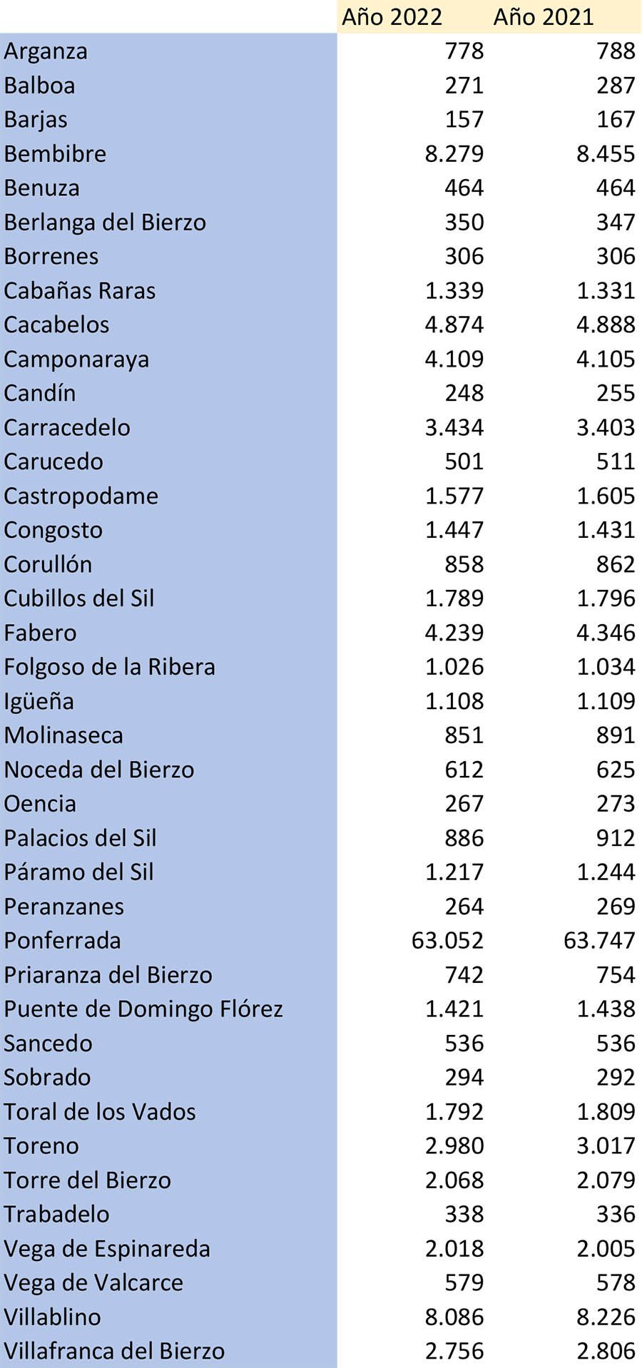El municipio que más habitantes pierde es Ponferrada, con 695 vecinos menos; seguido de Bembibre (176 menos) y Fabero (107 menos). En cuarto lugar, está Villafranca (50 menos) y después Molinaseca (40 menos).