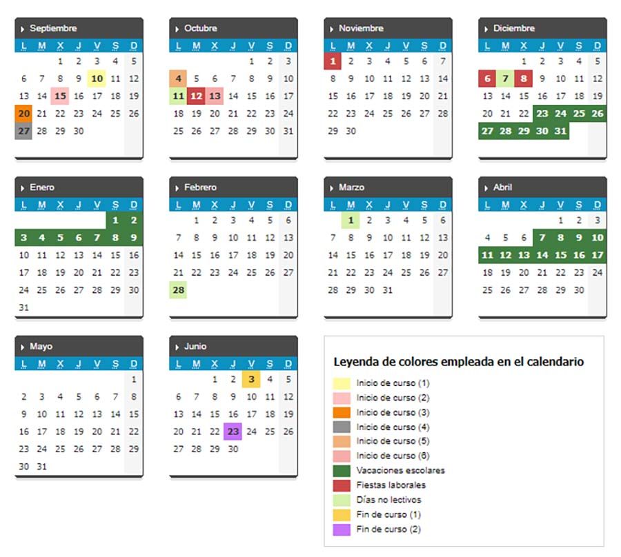 Asimismo, las vacaciones de Navidad comprenderán del 23 de diciembre al 9 de enero, ambos inclusive, y las de Semana Santa, del 7 al 17 de abril. Además de los festivos establecidos en el calendario laboral de la Comunidad, y de los dos días correspondientes a las fiestas de carácter local acordados para cada municipio, tendrán la consideración de días no lectivos el lunes 11 de octubre -Día del Docente-, el 7 de diciembre –Puente de la Constitución- y los días 28 de febrero y 1 de marzo -fiestas de Carnaval-.