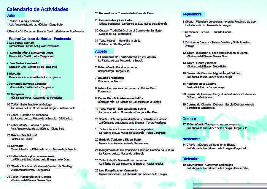 Estas actividades se desarrollarán principalmente en Ponferrada, pero también tendrán lugar en otras localidades de la comarca. Próximamente se abrirán las inscripciones a cada actividad. Los actos realizados en la Fábrica de Luz. Museo de la Energía serán totalmente gratuitos.
