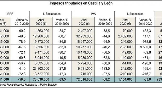Las cifras que maneja la Agencia Tributaria revelan que durante abril, la recaudación en Castilla y León se situó en los 239,4 millones de euros, lo que supone un descenso del 58,3 por ciento respecto al mismo mes del año anterior, es decir, 334,66 millones menos. Sobre mojado llueve, ya que la recaudación en la Comunidad, ya entró en negativo el pasado mes de marzo, cuando se recaudaron en Castilla y León, 99,75 millones de euros, lo que supone un descenso del 2,7 por ciento, respecto al mismo periodo de 2019.