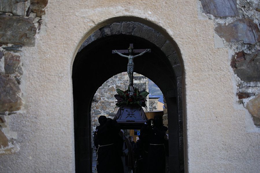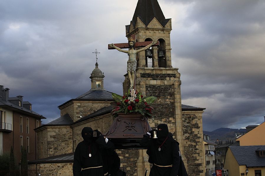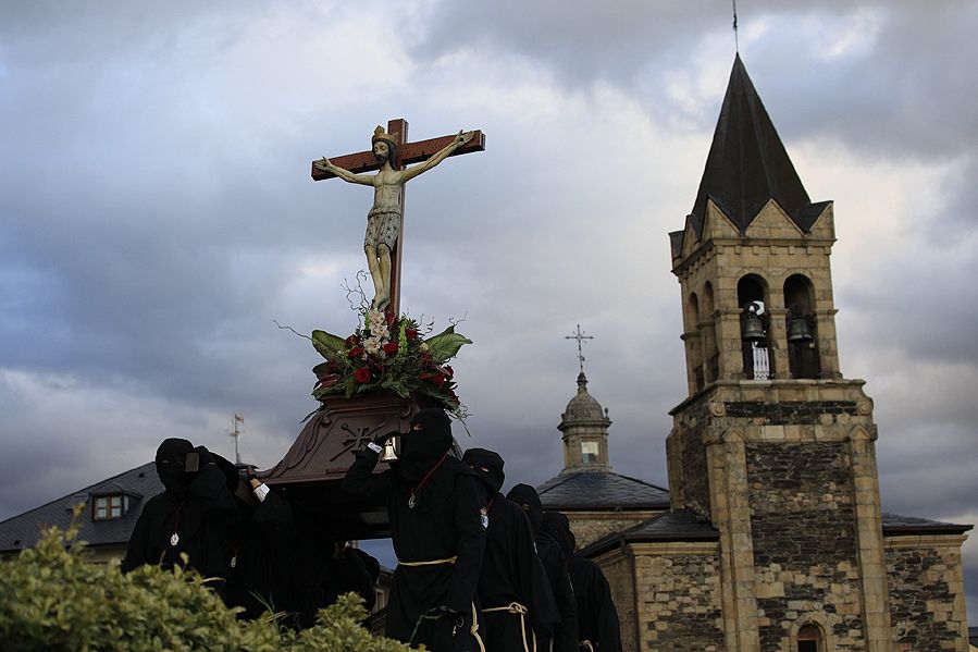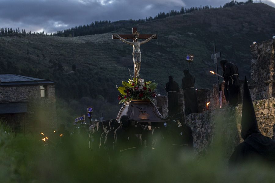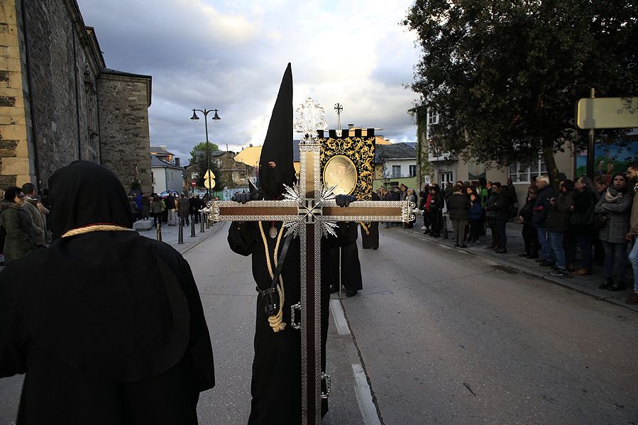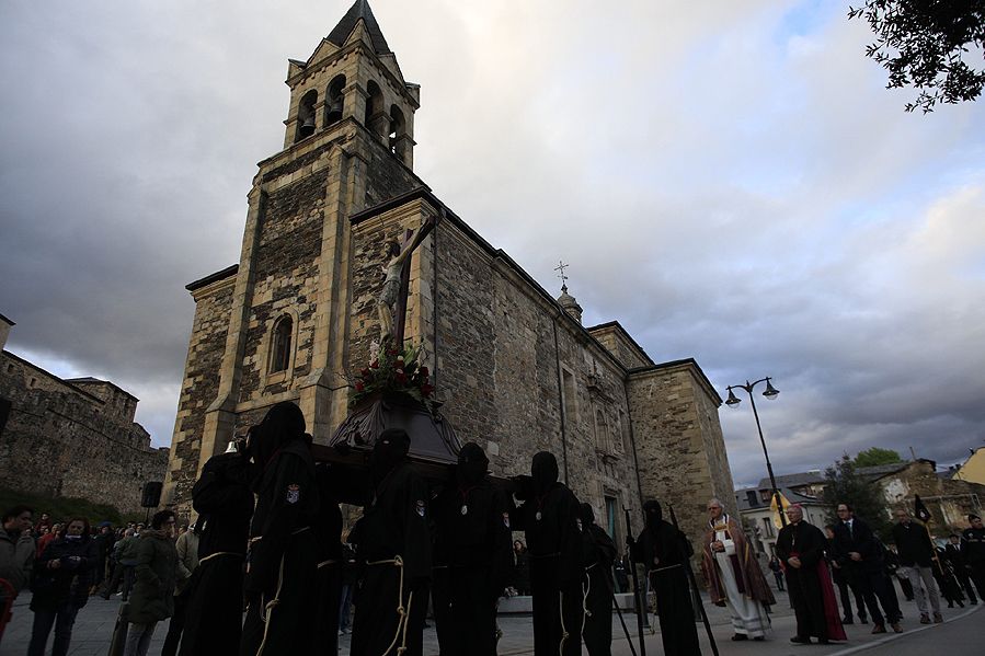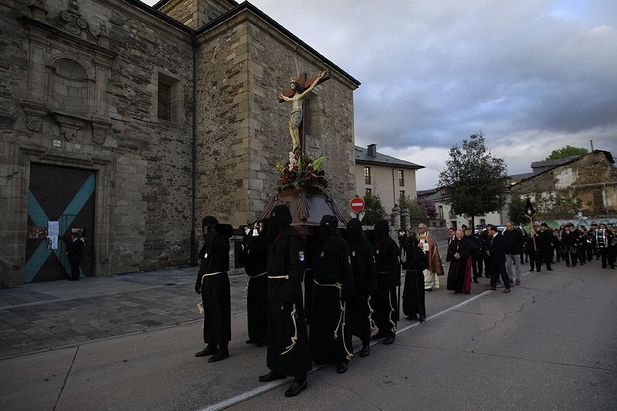 Esta procesión se recuperó hace cinco años, en 2014, con el objetivo de impulsar la declaración de la Semana Santa de Ponferrada como de Interés Turístico Nacional y que obtuvo al año siguiente. Su origen se remonta a los años 40 del siglo pasado y se desarrollaba por el casco antiguo de la ciudad con grandes cruces colocadas en algunas de sus fachadas -y que se han rescatado este año-. No había paso y era el mayordomo quien iniciaba el recorrido con un crucifijo de mano hasta la primera estación, cuando lo pasaba a otro de los hermanos que se iban alternando para llevarlo en las diferentes estaciones del Vía Crucis hasta finalizar otra vez en la basílica de La Encina.