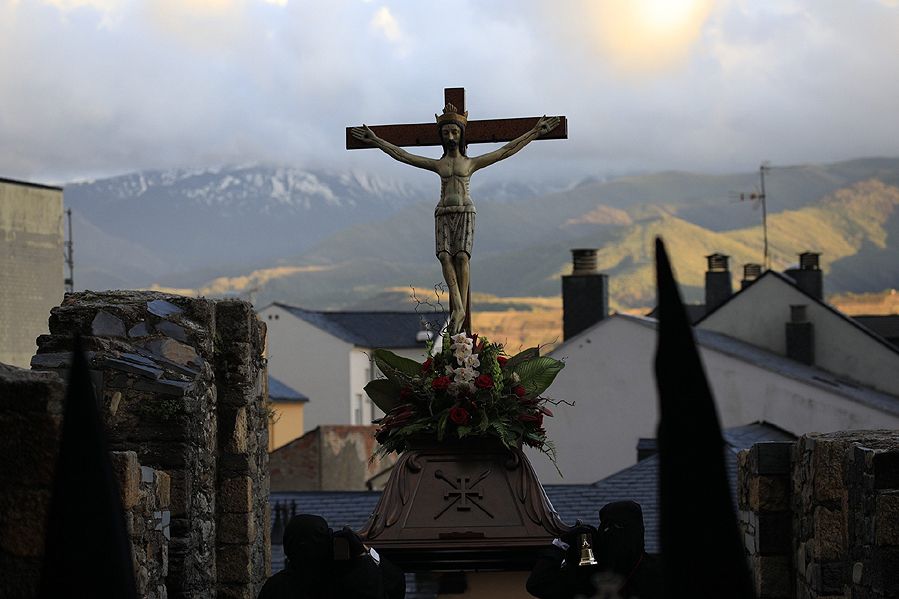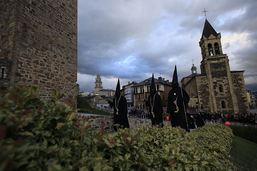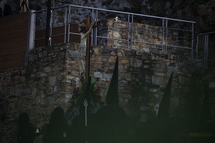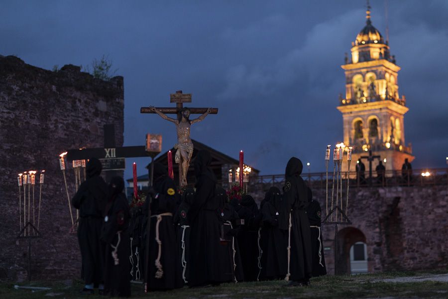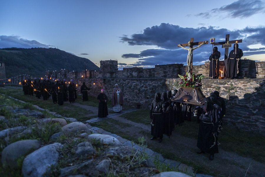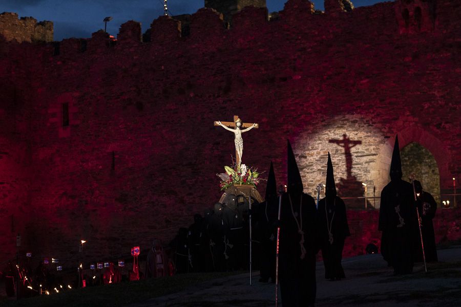 Los cofrades de la Real Hermandad de Jesús Nazareno llevaban todo el lunes mirando al cielo, con la esperanza de que finalmente la lluvia no "aguase" el Via Crucis penitencial en el castillo de los Templarios. Y así ha sido. De nuevo la lluvia ha vuelto a respetar al Cristo de la Esperanza y al Cristo de la Fortaleza en su recorrido desde la iglesia de San Andrés, para entrar en el castillo templario con la caída del crepúsculo y seguir las 14 estaciones de penitencia que marcan cada uno de los momentos de la Pasión de Cristo, acompañados por las voces de la Ronda de El Salvador de Toral de Merayo. Como novedad este año, se han vuelto a utilizar las antiguas cruces de madera para marcar cada una de esas estaciones en el patio de Armas.