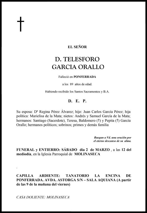 El cuerpo de un hombre sin vida hallado este miércoles en el barrio de La Placa de Ponferrada pertenece a Telesforo García Orallo, el anciano que desapareció el pasado mes de agosto de las inmediaciones de la residencia de Flores del Sil donde residía junto a su mujer. Según informó la Subdelegación del Gobierno en León, en la inspección ocular realizada por los agentes de la Policía Nacional se encontraron una serie de indicios que apuntaban a la posibilidad de que se tratase de Telesforo y se procedió también a realizar la autopsia para esclarecer las causas de su muerte, cuyos resultados pueden demorarse al haber sido necesario realizar una prueba de ADN.