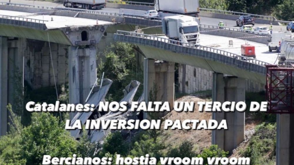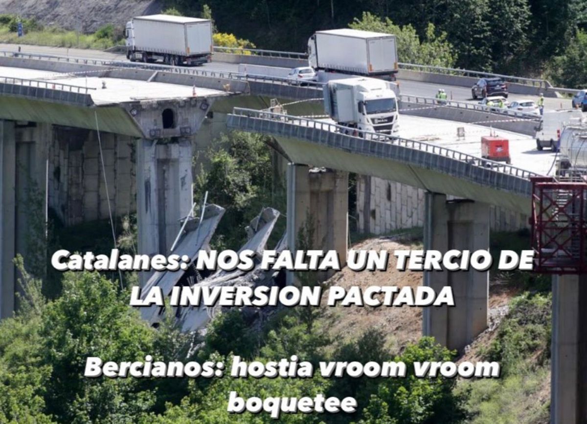 Tanto es así que el periodista villafranquino pero también gallego, Daniel Bernardo, es el autor de este meme que durante la pasada jornada subió a su cuenta de Instagram y ha cedido a InfoBierzo. En esta pieza gráfica, se puede observar el importante suceso para con los transportes y comunicaciones. Sin embargo, Bernando hace una comparativa entre lo que harían los catalanes frente a la actitud berciana, según su criterio. "Catalanes: Nos falta un tercio de la inversión pactada" mientra que los "bercianos: hostia vroom vroom boquete". Es decir, reclamar versus quedarse con el envase, y no con el contenido.