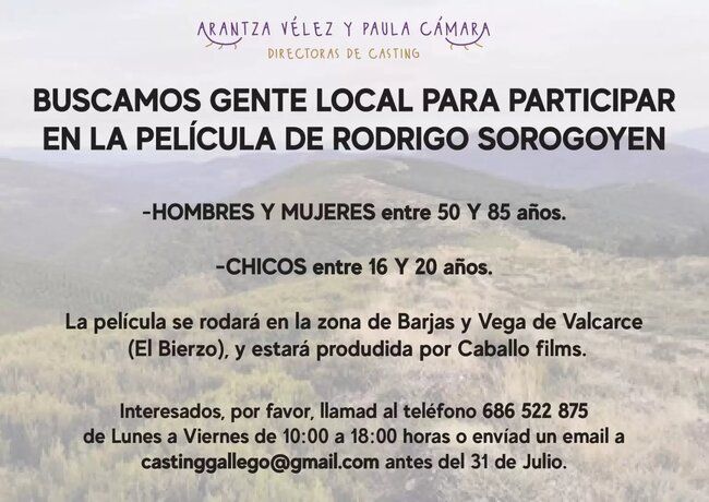 Para la película necesitan hombres y mujeres entre 50 y 85 años y chicos entre 16 y 20 años. Quienes estén interesado pueden llamar de lunes a viernes de 10 a 18 horas al teléfono 686522875 o enviar mail a castinggallego@gmail.com antes del 31 de julio.