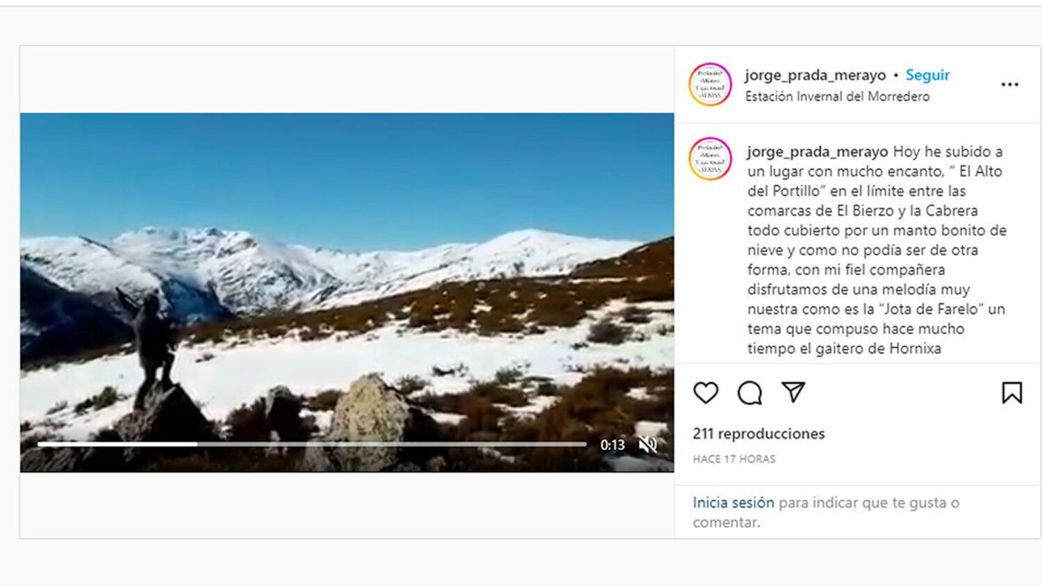 "Hoy he subido a un lugar con mucho encanto, “ El Alto del Portillo” en el límite entre las comarcas de El Bierzo y la Cabrera todo cubierto por un manto bonito de nieve y como no podía ser de otra forma, con mi fiel compañera disfrutamos de una melodía muy nuestra como es la “Jota de Farelo” un tema que compuso hace mucho tiempo el gaitero de Hornixa (Corullón) José Farelo. He de reconocer que no fue fácil ya que con el frío y el viento se me congelaban los dedos. ", afirmaba en el post.