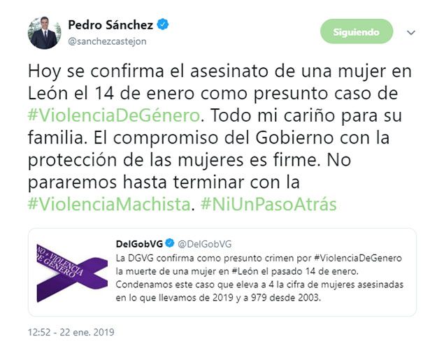 También en su cuenta de Twitter, el presidente Pedro Sánchez expresa su pesar por este suceso que eleva a cuatro la cifra de mujeres asesinadas en las primeras semanas de 2019 (979 desde el año 2003). Sánchez expresa que “el compromiso del Gobierno con la protección de las mujeres es firme. No pararemos hasta terminar con la violencia machista”.