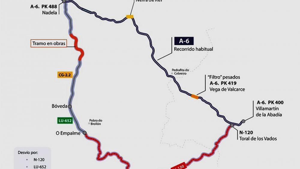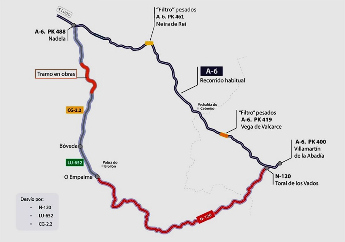 Comienzo del desmontaje de las pilas 1 y 2 del viaducto del Castro sentido A Coruña de la A-6 en Vega de Valcarce (León)La previsión del Ministerio es que este protocolo de vialidad invernal tenga carácter provisional ya que el próximo invierno al menos uno de los viaductos estará operativo para la circulación de vehículos en ambos sentidos. Los vehículos pesados que circulen por la A-6 en sentido A Coruña deberán abandonar esta vía en el P.K. 400, enlace de Toral de los Vados (León) y utilizar las carreteras N-120 (hasta A Pobra do Brollón, Lugo), LU- 652 (hasta Bóveda, Lugo) y CG 2.2, retornando a la A-6 en el PK 488 enlace de Nadela.