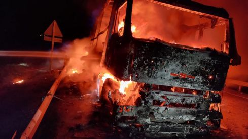 El incendio de un camión de paquetería en la entrada de San Miguel del Camino durante la madrugada de este miércoles, provoca todavía a esta hora retenciones y cortes en la N-120 dirección Astorga.