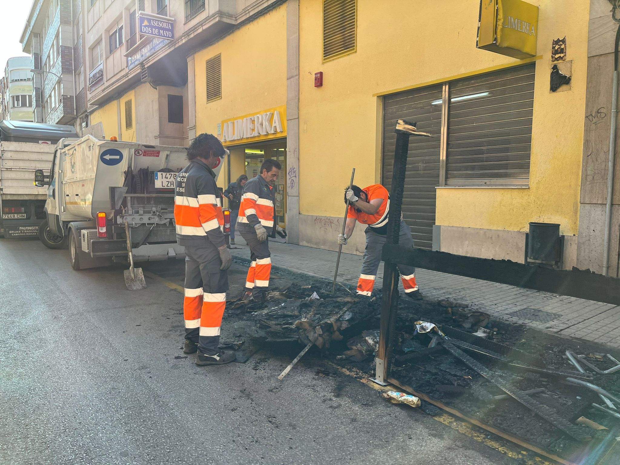 Cuando se encontraban realizando sus trabajos en la calle Dos de Mayo, recibieron el aviso de un incendio en un contenedor en la calle Antolín López Peláez. Finalmente las tareas de extinción se vieron terminadas alrededor de las 05:15 horas, explican fuentes oficiales.