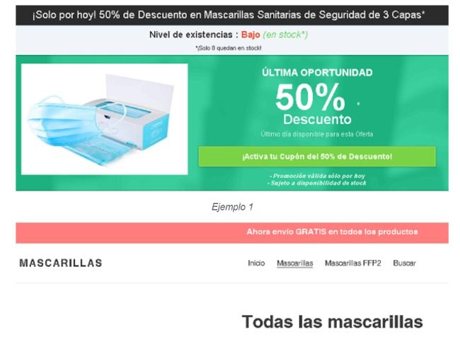 En la misma línea, el INCIBE advierte de de la identificación de páginas web fraudulentas que intentan engañar a los usuarios con la venta de mascarillas, aunque también ofertan otros productos y materiales sanitarios de interés para los ciudadanos: geles hidroalcohólicos o productos desinfectantes. En muchos casos el usuario no llega a recibir el pedido y en otros si lo recibe, no corresponde con las especificaciones indicadas en la web.
