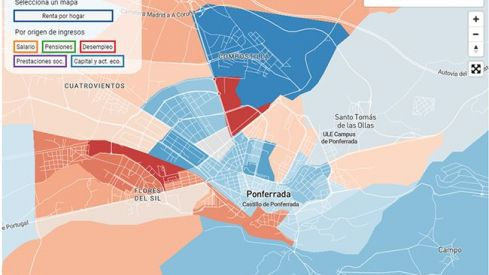 La grieta económica entre el barrio más rico y el más pobre de Ponferrada es notable, con una diferencia de 17.444 euros entre uno y otro. Sin embargo, es curioso observar que el barrio donde el mayor porcentaje de ingresos proviene de las pensiones (44,3%) es curiosamente la segunda zona más 'pobre' de la ciudad, el barrio del Toralín. Le sigue una parte del barrio de Flores del Sil — donde se sitúa el Hotel Temple— donde el porcentaje de las pensiones se dispara hasta suponer el 43% de los ingresos (21.439 euros de renta media) y en el barrio de Columbrianos supone un 38% de la renta media que alcanza los 22.351.