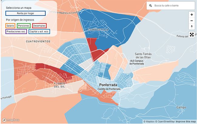 El barrio de Compostilla aglutina la mayor cifra de renta media por hogar de Ponferrada, situándose en 36.515 euros por hogar al año, le sigue la urbanización de Aldama con una media de 33.699 euros y el barrio de las Huertas, situado en el centro de la capital del Bierzo, con 33.395 euros, según los datos del Instituto de Estadística Nacional (INE).