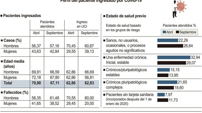 Frente a lo que se pueda pensar, la mayoría de ingresos se da en personas con una enfermedad crónica estable, en un 32,9 por ciento en abril, ahora con un 29,07 por ciento, con mayor incidencia en los grupos de 45 a 64 (33,77 por ciento en abril y 32,36 en septiembre) y de 65 a 74 años (38,55 y 31,95).