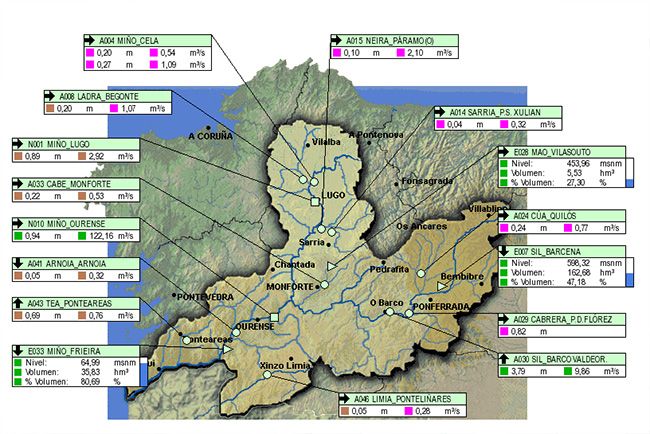 Por otro lado, el Boeza a su paso por Boeza se encuentra en nivel "muy bajo" (0,16m), el río Tremor a su paso por Almagarinos se encuentra en nivel "bajo" (0,13m), el río Boeza a su paso por Bembibre se encuentra en nivel "normal" (2,73m),y por último el Sil a su paso por Ponferrada, registra un nivel de "normal" (0,14m).