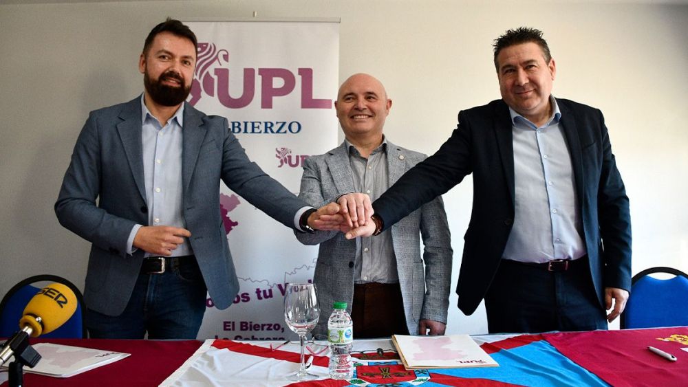 César Sánchez / ICAL. El secretario general de Unión del Pueblo Leonés, Luis Mariano Santos (D), junto al secretario comarcal de El Bierzo y procurador en las Cortes de Castilla y León, José Ramón García (I), presentan al candidato a la Alcaldía de Ponferrada para las próximas elecciones municipales, Manuel Ferreiro (C)